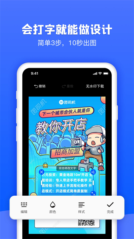 只需改字换图,3步7秒,手机一键出海报。无门槛做图做视频,从此设计不求人。