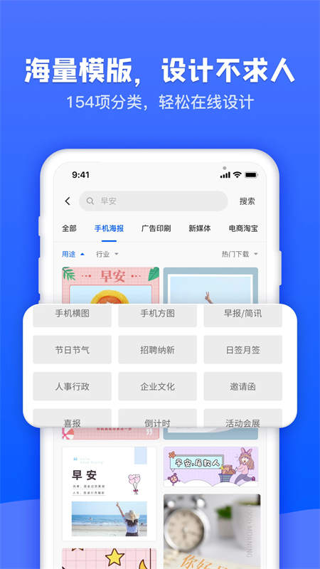 一键制作海报、壁纸、logo、邀请函、喜报、战报、贺报、日签(早晚安)、表情包、头像、GIF动图、传单名片、易拉宝、菜单优惠券、展架、封面、营销长图、电商banner、朋友圈配图、公众号封面、贺卡请柬、个人简历、婚礼邀请函、微商电商宣传、招生培训、开业活动、产品介绍、总结报告等,满足您不同场景的各类设计需求。