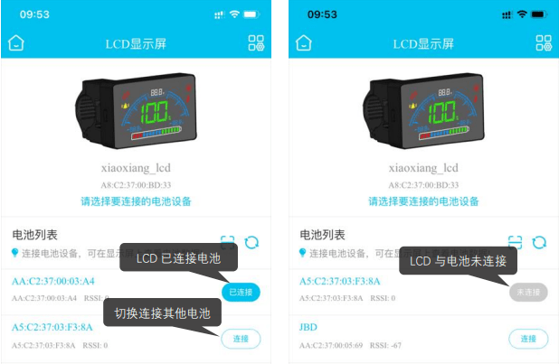如果需要切换连接其他电池,直接在电池列表中,选择其他电池,点击“连接“,即可完成切换STEP5:连接成功,则可在 LCD 屏幕查看电池基本数据