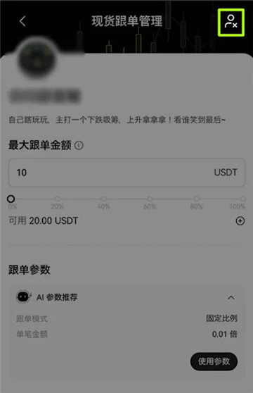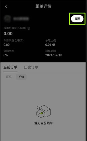 进入页面,选择想要取消的订单,点击【管理】- 右上角【头像】图标 -【确认】,取消该跟单交易。