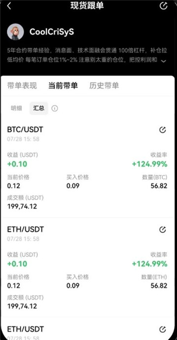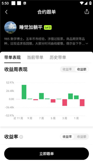3, 在交易员页面,点击头像查看带单详情,或选择【立即跟单】进入【跟单设置】,,填入【单笔跟单金额】和【最大跟单金额】信息,点击【立即跟单】。但是当您有合约持仓和合约交易时,需要先平仓和取消订单,才能成功跟单。