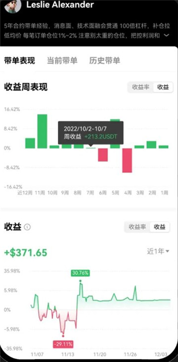 点击【跟单】或交易员的头像查看交易员详细信息,例如带单规模,历史收益等。