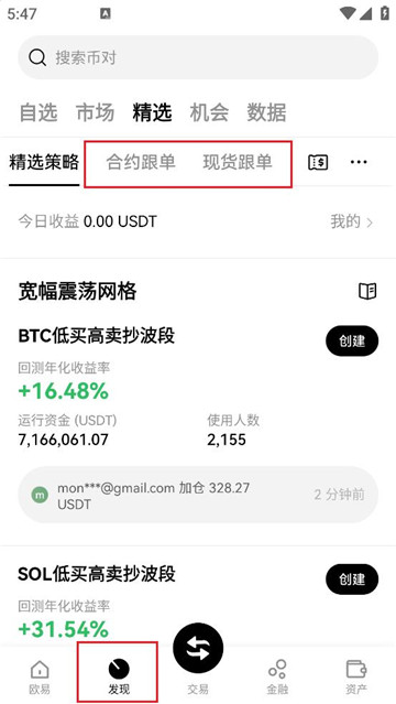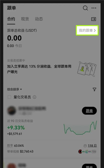 2,首页选择【发现】,顶部选择【跟单】,可在【跟单广场】看到带单交易员的收益率。选择【综合排序】,可按照不同的方式进行排序,选择你要跟单的交易员,点击【跟单】。