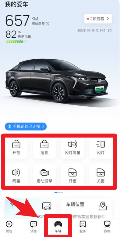 2、在车辆界面可以远程操作开锁、落锁、鸣笛、闪灯等功能,手机即可充当智能车钥匙。