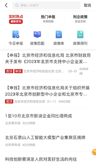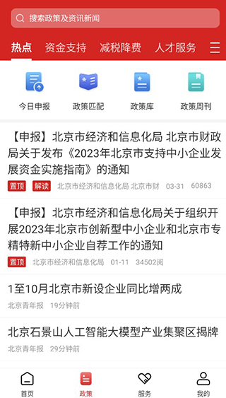 3.用户可以点击下方政策,查看北京市的热点政策,以及资金支持、减税降费等实时政策,有助于帮助企业快速了解政策,做出相应的改变。