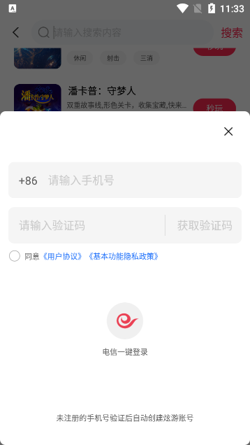 下载安装软件,打开天翼云游戏app,点击账号注册登录