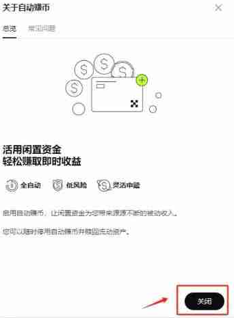 2、在弹出的页面中,点击右下方的【关闭】就完成自动赚币关闭操作了