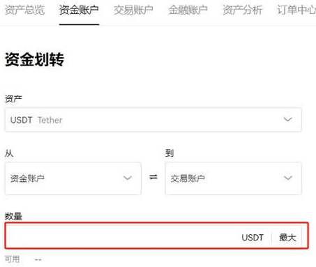 3,选择币种USDT并输入数量,点击确认即可(注意划转方向为现货账户到资金账户)
