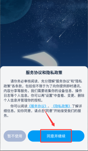 1、在应用中点击"同意并继续"服务协议,进入登录界面。