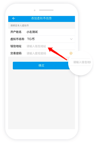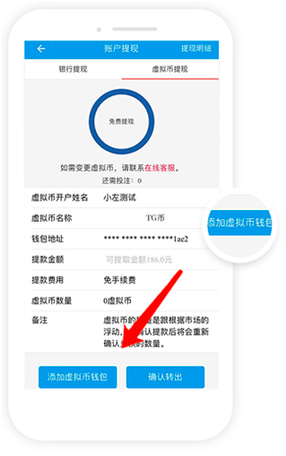 在提币页面,点击 “添加虚拟币钱包” 按钮。 按照App提示,添加你的收款钱包。