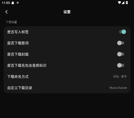 2.进入到设置界面,根据自己的需求,可以选择打开是否写入标签、歌词、封面等元素,以及设置下载音乐所保存的位置。