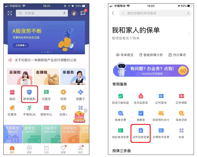 2.点击保单服务,选择证件信息变更。