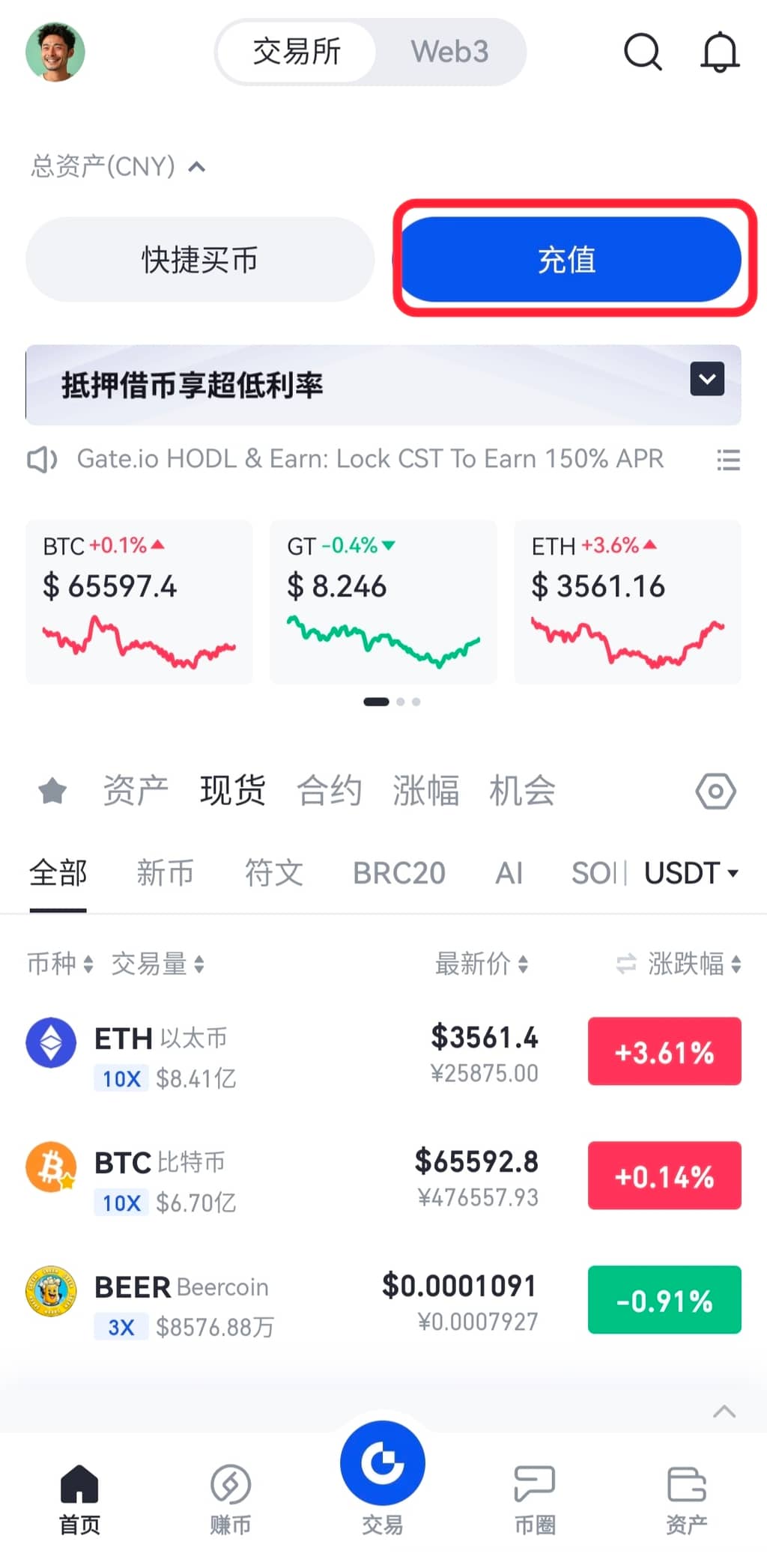 1、打开Gate.io手机App,登录个人账户,点击主页上的“充值”,或点击右下角“资产”—“充值”。