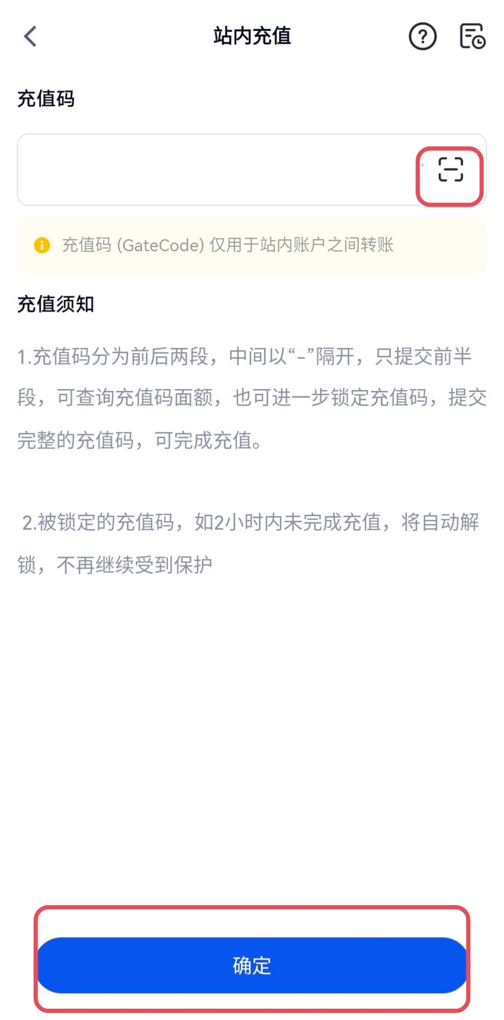 3、在充值码充值页面,选择扫描二维码/剪切板粘贴充值码进行充值,核实无误后点击“确定”。