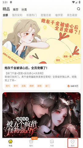 1、首先打开点点穿书软件,进入到首页中后可以切换到福利、书架、我的页面,我们点击右下角的【我的】;