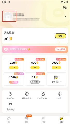 2、然后在我的页面中可以购买能量,在这里我们点击左上角的【头像】;