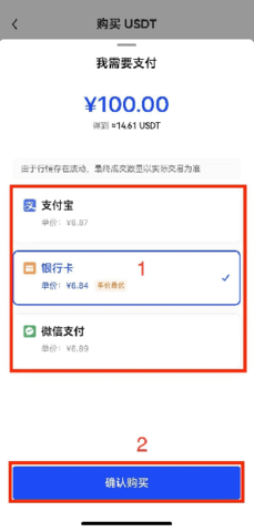 输入您想要购买的金额或币种数量,选择购买USDT,然后选择支付方式,最后点击“确认购买”。