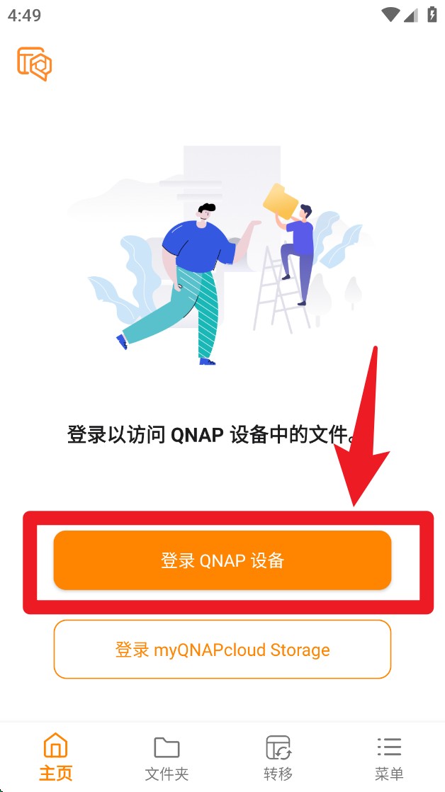 1. 打开 App 后,点击首页画面中央的「登录 QNAP 设备」按钮,即可进入登录流程。建议连接 Wi-Fi 环境操作,提升连接速度与体验流畅度。