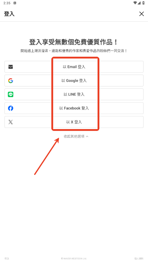1.进入软件,你可以通过多种渠道注册登录。如果你没有快捷登录账户,可以点击邮箱注册。