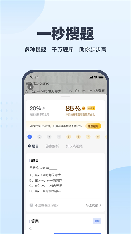 1、拍照搜题:相机对准题目一拍,秒出答案,解题速度我最快。
