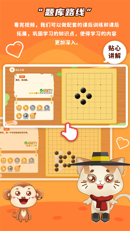 课程通过细化围棋知识点,每个围棋知识点都采取视频讲解知识点,课后习题强化学习的知识,课后拓展不断巩固提高,AI陪练指导下棋,将学习的知识点逐渐综合运用起来。使得围棋学习简单有趣,又具有挑战性。