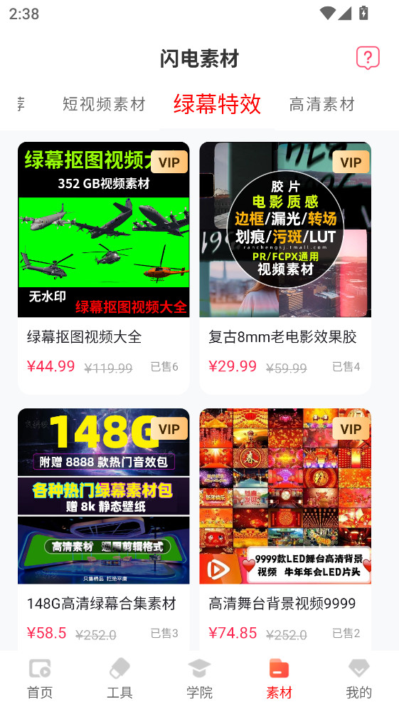 4.在素材中推荐大量优秀素材,包括短视频素材、绿幕特效、高清素材等。