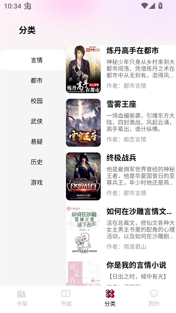 2、接下来我们可以点击书城功能来获取到言情、都市、校园、武侠、悬疑等多种类型的小说。