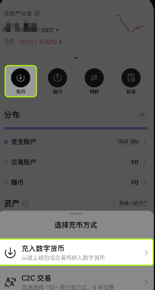打开欧易App,点击【资产】—【充币】—【充入数字货币】;