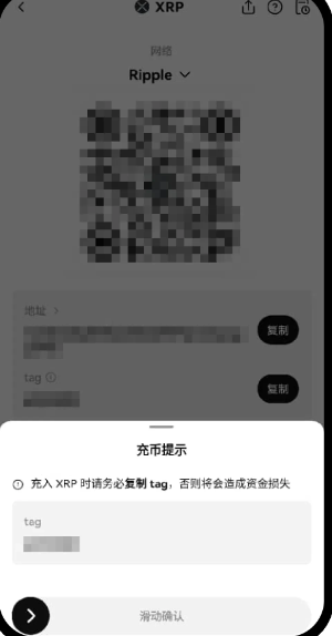 您选择的币种网络若需要填写标签(又名Tag/Memo,通常是一串数字),系统会有提醒,【滑动确认】后即可查看并复制该币种的【充币地址】与【标签】。