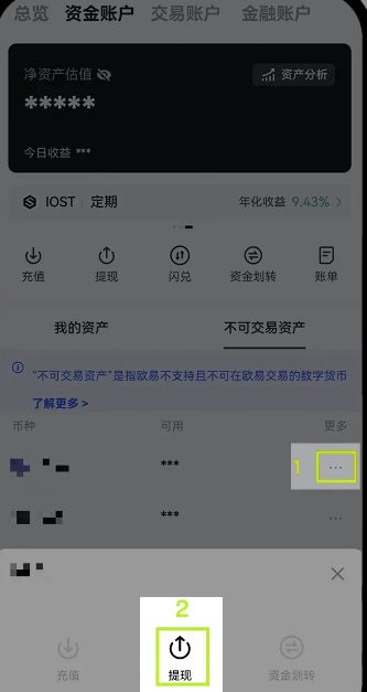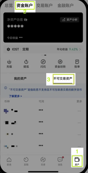 1,点击【资产】-【资金账户】。您早前充值到欧易的不可交易资产将于【不可交易资产】显示。