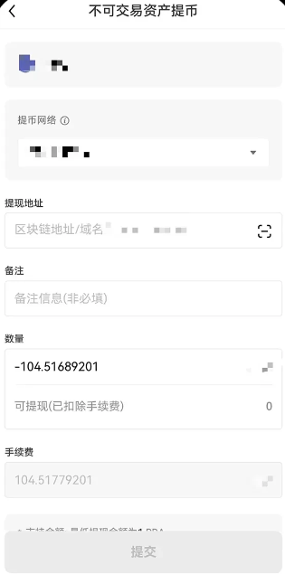 2.点击【不可交易资产】后,再点相应资产后面的“‧‧‧”图标 — 选择【提现】,即可前往【不可交易资产提币】页。