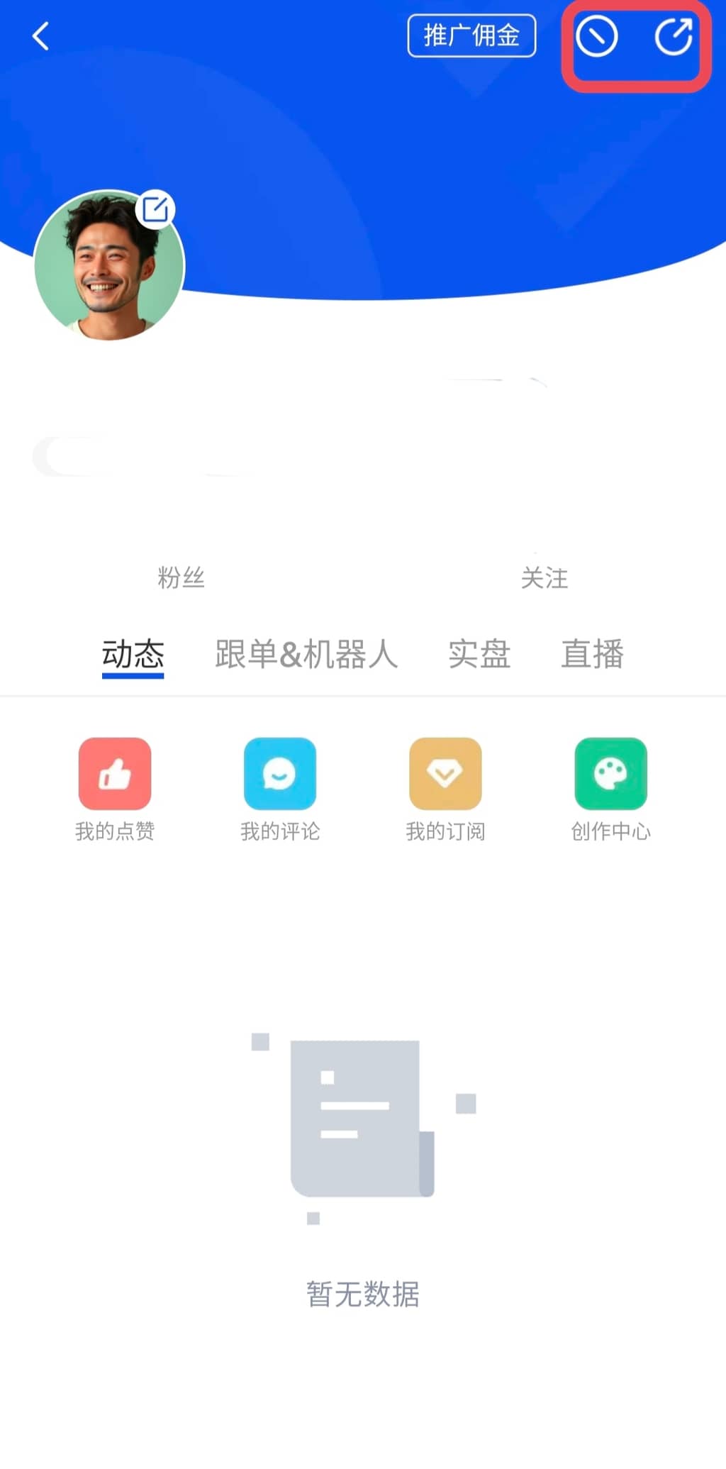 3、进入主页后,页面右上角从左到右依次为:“我”的动态屏蔽名单 、个人主页二维码转发功能。