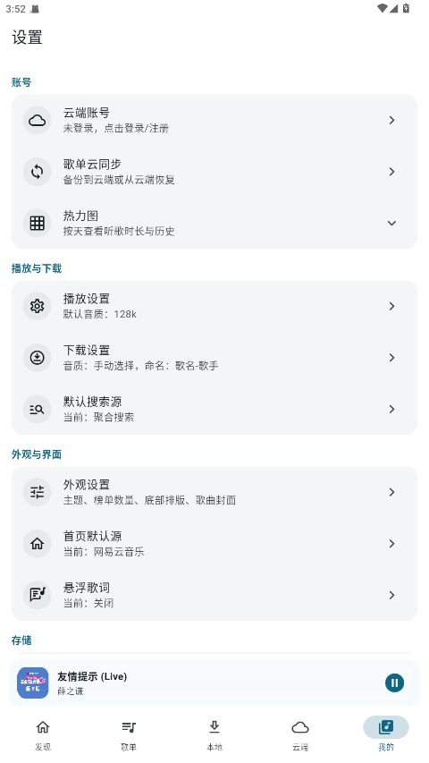 7.在 “我的” 设置中心,调整播放音质、缓存路径、歌词显示样式,自定义 App 使用体验。