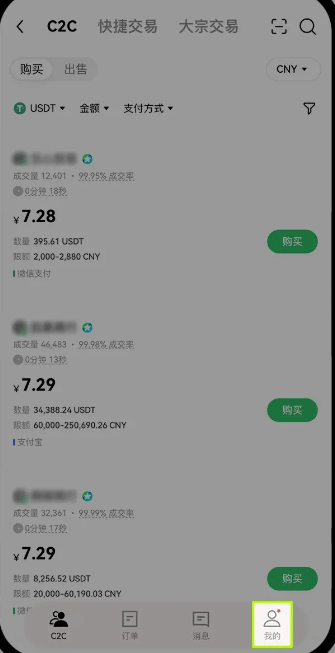 打开o易app,点击【C2C买币】-右下角【我的】图标-【收款账号管理】。