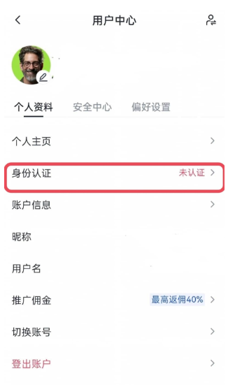 1、打开k豆pay钱包手机App,登录个人账户——点击左上角“头像”,再次点击头像标识——选择“个人资料”——“身份认证”——“去认证”,进行个人身份认证。