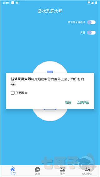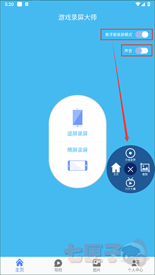 1、在本站下载安装游戏录屏大师app并打开,在录屏开始前,可以自由设置【悬浮窗录屏模式】、【声音】等功能,开启【声音】功能后,在录制时将会把你的声音给录制进去;