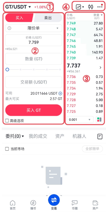①选择对应的交易对进行交易②在“买入”/“卖出”页面,选择委托条件,可设置“委托价格”、“委托数量”③可以从右侧盘口处选择以对应价格进行“买入”/“卖出”操作④从左到右分别为所选交易对K线图展开;所选交易对行情数据分析等详情界面;交易功能设置