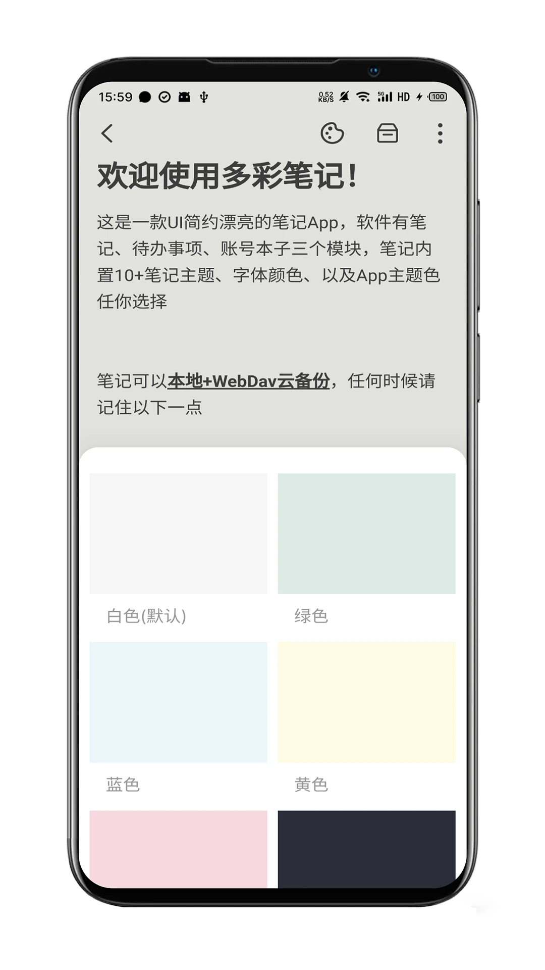 2、多彩笔记app内具有webdav(用坚果云即可)备份,还提供了本地备份,就算换手机也不用怕数据丢失了,用户只需在我的界面点击备份功能即可进入此界面,在进行选择添加即可;