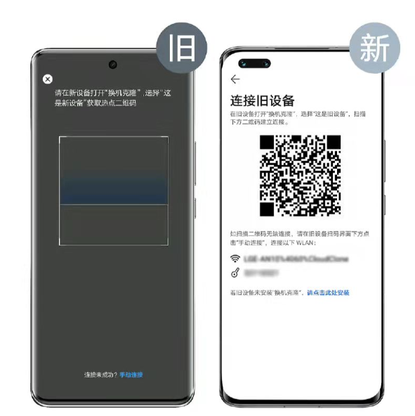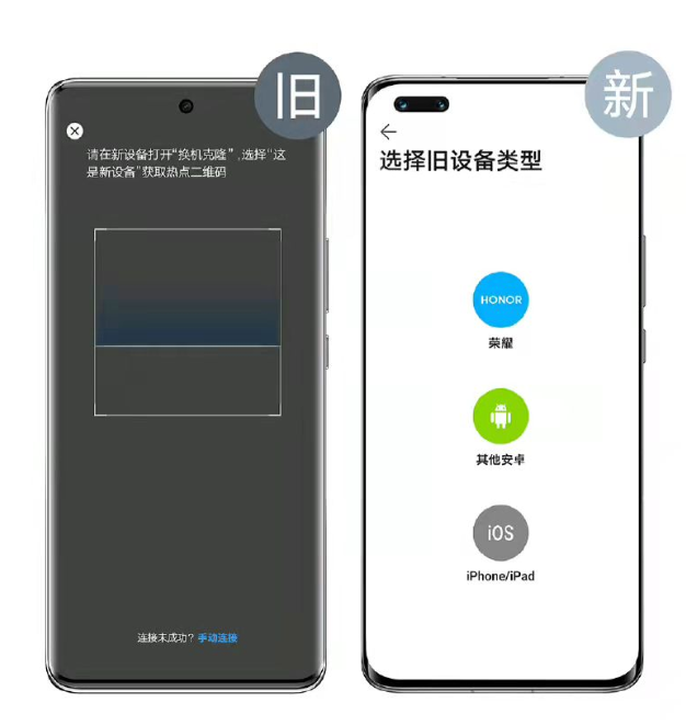 4、根据指引扫描新设备上的二维码,连接之后,旧手机上的数据就能传输到新设备了。