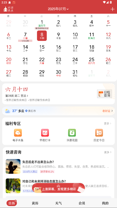 中华万年历是一款集日历、黄历、节气、吉日查询等功能于一体的传统文化应用。用户可以查看详细的农历、节假日、星座运势等信息,帮助规划日常生活。解锁会员版后,用户可以享受更多专业功能,如精准的黄历宜忌查询、私人定制吉日推荐、无限制的节气提醒等服务。应用界面清晰、操作简便,支持一键查询历史和未来的黄历信息,是关注传统文化和日常生活规划的用户必备工具。