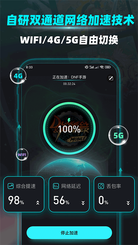 疾风加速器有着专业的技术团队支持,自主研发电竞级网络双通道技术,在WIFI和4G/5G流量环境下都有着稳定的加速效果,让用户随时随地不受地理环境的网络干扰,畅快进行游戏体验。