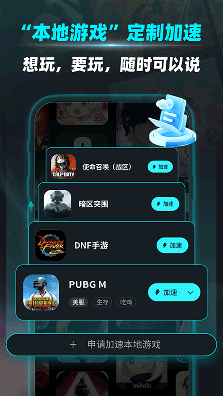 疾风加速器目前覆盖的游戏种类丰富多样,支持一键加速Pubg手游、DNF韩服、使命召唤、暗区突围、碧蓝档案、炉石传说年等热门手游外服,更好地满足用户对于不同类型游戏加速的需求,是你身边的游戏助手。