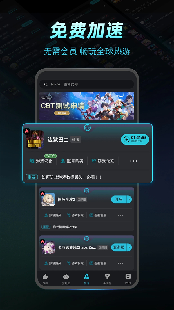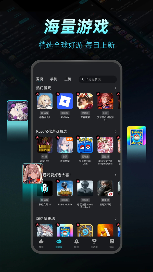 覆盖全球热门手游,包括PUBGM、使命召唤国际服、王者荣耀国际服、Nikke:胜利女神、DNF韩服、炉石传说国际服、第五人格国际服、边狱巴士韩服、roblox国际服、宝可梦TCG-LIVE、代号鸢、棕色尘埃2、咒术回战幻影游行日服、碧蓝档案日服、鹅鸭杀国际服、学园偶像大师日服、忘却前夜、宝可梦大集结、游戏王:决斗大师、永恒灵魂、我独自升级国际服、绝区零国际服、鸣潮国际服、原神国际服、Trickcal Revive韩服等游戏免费加速,等你来玩!