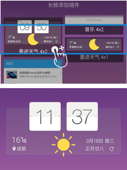 3.选择某种尺寸的墨迹天气小插件,长按拖动到桌面上即可。