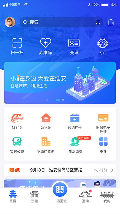 I淮安APP官方版支持社保公积金查询、户政业务办理、交通出行、就医挂号、财政奖补、政企互动、透明食安等服务,让淮安市民只需一部手机,即可畅享所有服务,欢迎有需要的用户前来下载使用。