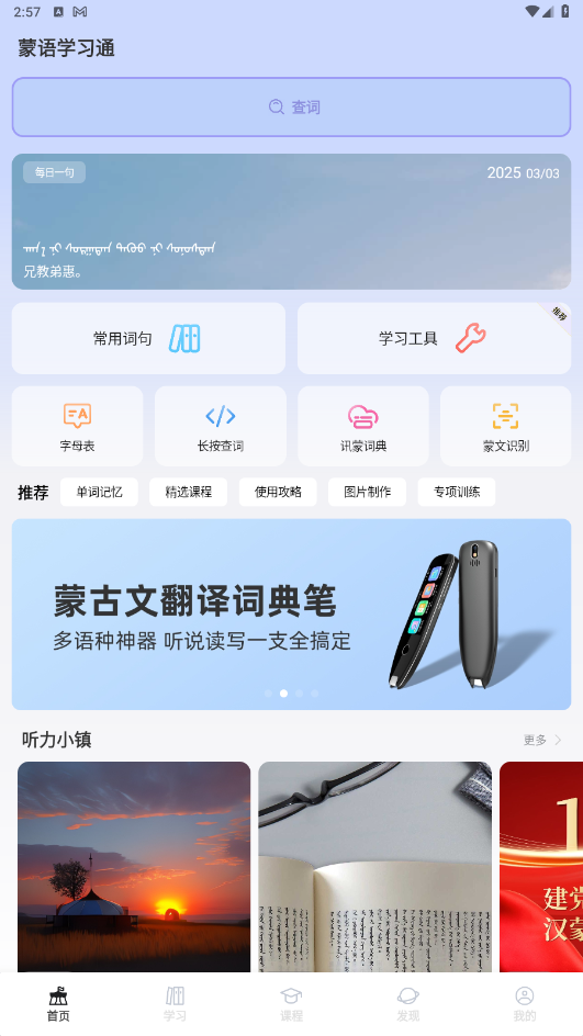 4.听力训练:使用听力训练模块,听取蒙语对话和句子练习,提升听力理解能力。