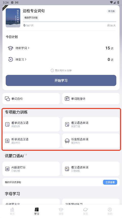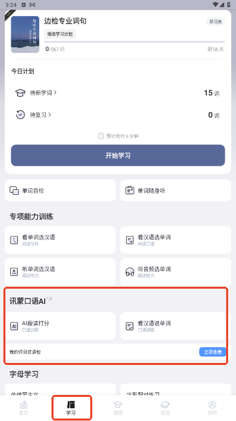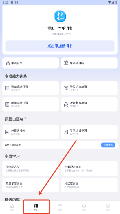 2.学习单词:在“学习”模块中,浏览和学习基础单词,应用会提供发音、拼写等信息,帮助记忆。