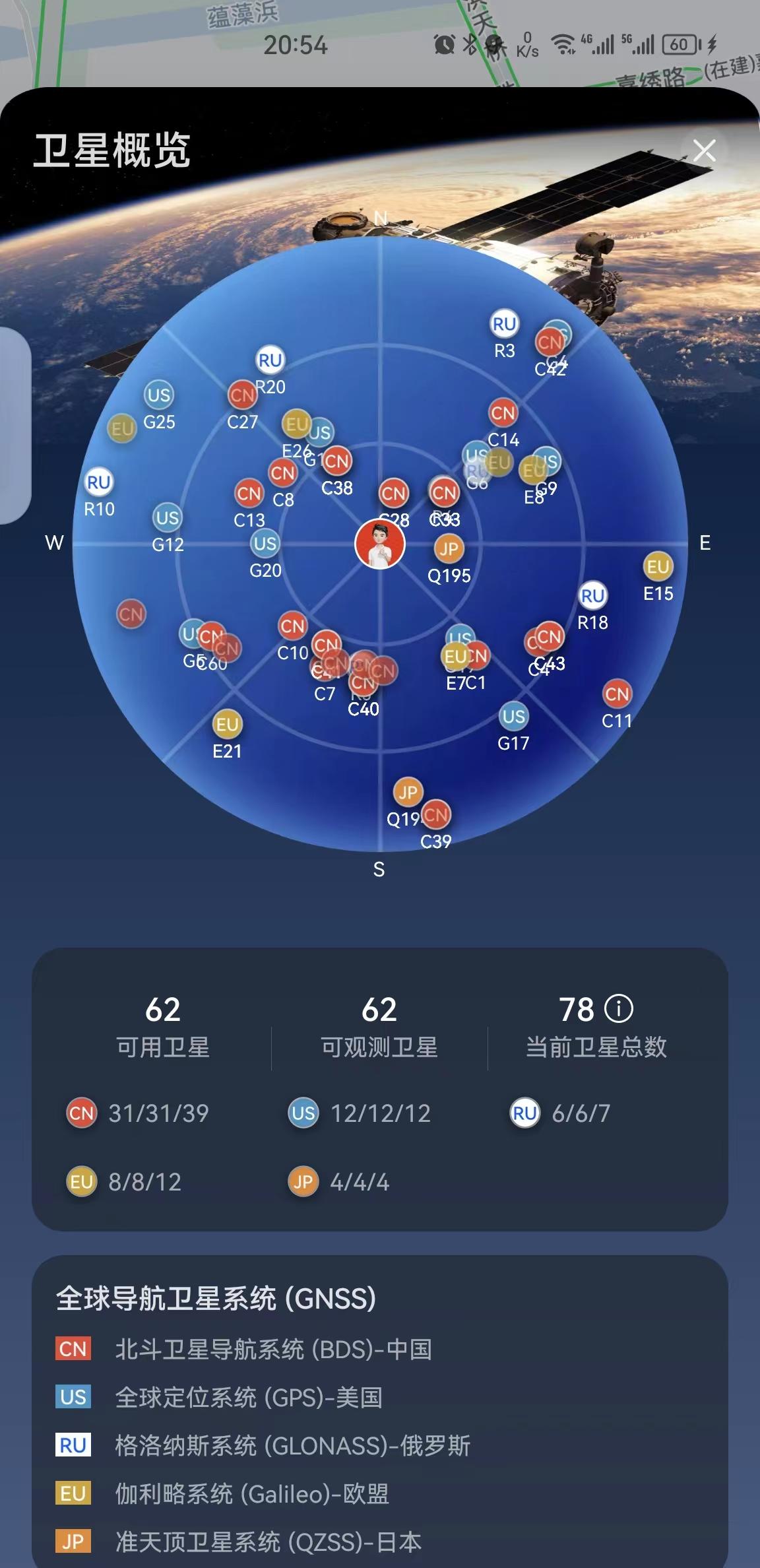 地图显示点击定位标,下方不仅显示我的位置信息,还显示卫星定位精度,并可进入卫星概览页面。卫星概览里显示当前定位信息及可用卫星,可观测卫星,当前卫星总数。