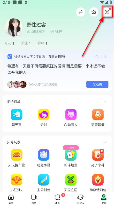 1、打开陌陌“更多”页面,点击右上角的小齿轮图标进入。