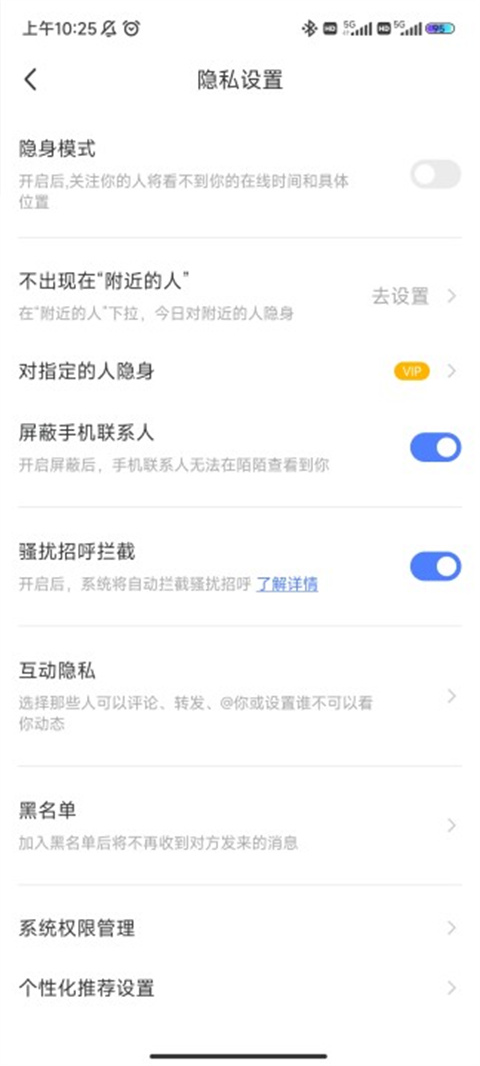 3、将“隐身模式”旁的小滑块点亮即可开启,开启后,关注你的人将看不到你的在线时间和具体位置,也可以在该页面通过设置“不出现在附近的人”实现对附近的人隐身,如果已经开通了VIP,还可以实现对指定的人隐身;通过点按小滑块可以切换是否屏蔽手机联系人,让手机联系人无法在陌陌查看到你。点击“互动隐私”可前往完成互动类信息的隐藏。